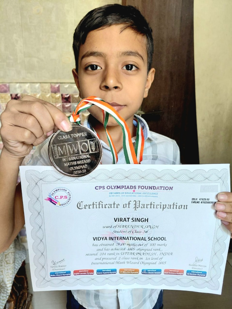 विद्या इंटरनेशनल स्कूल के छात्र विराट सिंह ने ओलंपियाड में किया उत्कृष्ट प्रदर्शन