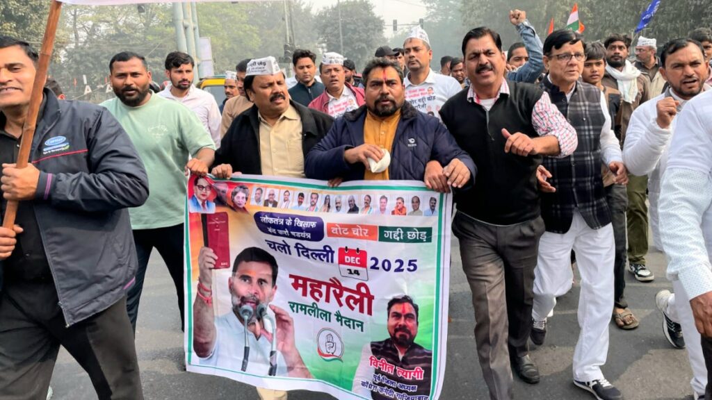 दिल्ली – रामलीला मैदान दिल्ली में रविवार 14 दिसंबर 2025 को अखिल भारतीय कांग्रेस कमेटी द्वारा आयोजित ऐतिहासिक ‘वोट चोर गद्दी छोड़ो’ रैली में देशभर से कांग्रेस नेताओं, सांसदों, विधायकों, प्रदेश कांग्रेस कमेटियों के पदाधिकारियों, फ्रंटल संगठनों के प्रतिनिधियों और लाखों कार्यकर्ताओं ने भाग लिया। रैली की विशालता का अंदाजा इसी बात से लगाया जा सकता है कि रामलीला मैदान और उसके आसपास चार किलोमीटर तक पैदल चलने की भी जगह नहीं बची थी। मैदान के भीतर प्रवेश के लिए भी भारी भीड़ उमड़ी रही और चप्पे-चप्पे पर कांग्रेस समर्थक मौजूद थे।