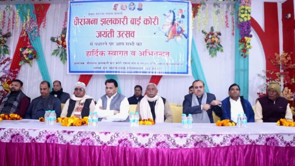 यूपी – मुजफ्फरनगर। स्थानीय रुड़की रोड स्थित दीपक पैलेस में वीरांगना झलकारी बाई कोरी एकता मंच एवं समस्त कोरी/भुईयार समाज के संयुक्त तत्वावधान में महान स्वतंत्रता सेनानी वीरांगना झलकारी बाई की 195वीं जयंती के अवसर पर विशाल विचार गोष्ठी का आयोजन किया गया। “क्रांति की झलक–झलकारी” विषय पर आयोजित इस कार्यक्रम में उत्तर प्रदेश सरकार के राज्यमंत्री (स्वतंत्र प्रभार) नरेंद्र कश्यप मुख्य अतिथि रहे।