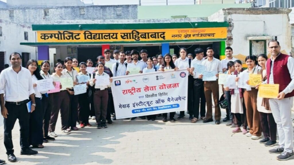 यूपी – गाजियाबाद। वसुंधरा स्थित मेवाड़ ग्रुप ऑफ इंस्टीट्यूशंस की एनएसएस इकाई का सात दिवसीय विशेष सेवा शिविर साहिबाबाद गांव के कंपोजिट विद्यालय में शुरू हो गया। शिविर की शुरुआत स्वयंसेवकों द्वारा श्रमदान और परिसर की साफ-सफाई से की गई। कार्यक्रम के प्रारंभ में स्वयंसेविकाओं ने सरस्वती वंदना और एनएसएस लक्ष्य गीत की प्रस्तुति दी।