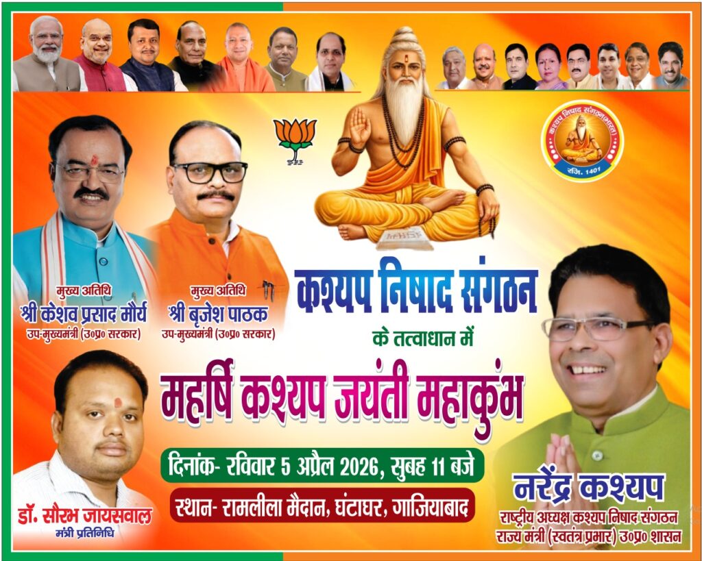 यूपी – गाजियाबाद महर्षि कश्यप जयंती के अवसर पर 5 अप्रैल को शहर के घंटाघर स्थित रामलीला मैदान में भव्य महर्षि कश्यप महाकुंभ का आयोजन किया जाएगा। इस विशाल कार्यक्रम का आयोजन उत्तर प्रदेश सरकार के स्वतंत्र प्रभार राज्य मंत्री एवं कश्यप निषाद समाज के राष्ट्रीय अध्यक्ष नरेंद्र कश्यप के नेतृत्व में किया जा रहा है।