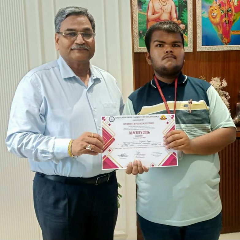 राज कुमार गोयल इंस्टीट्यूट ऑफ मैनेजमेंट एंड टेक्नोलॉजी में आयोजित एड-मैड शो में प्रियांश आर्य ने उत्कृष्ट प्रदर्शन करते हुए रनर-अप स्थान प्राप्त किया। उनकी प्रस्तुति में रचनात्मकता, प्रभावशाली संवाद कौशल और मार्केटिंग की समझ ने निर्णायकों को प्रभावित किया। इसी संस्थान में आयोजित बिजनेस आइडिया पिचिंग प्रतियोगिता में उन्होंने प्रथम स्थान हासिल किया। उनके अभिनव विचार और आत्मविश्वास से भरी प्रस्तुति सराहनीय रही।