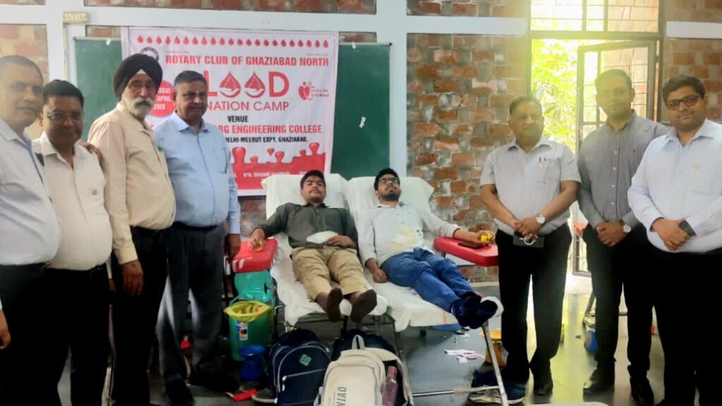 यूपी – गाजियाबाद। रोटरी क्लब गाजियाबाद नॉर्थ एवं रोटरी विकास के संयुक्त तत्वावधान में बृहस्पतिवार, 16 अप्रैल 2026 को एनएच-9 स्थित ए.के.जी. इंजीनियरिंग कॉलेज में विशाल रक्तदान शिविर का आयोजन किया गया। इस शिविर में विद्यार्थियों ने बढ़-चढ़कर भाग लेते हुए कुल 475 यूनिट रक्तदान किया।